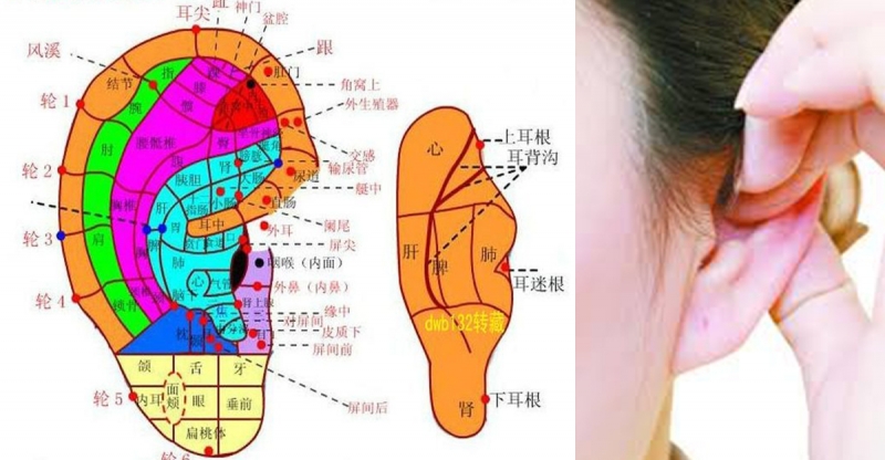 用雙手拇、食指捏住耳朵上部,先揉捏此處,直至該處感到發熱為止,然後再往上提揪15-20次。此處主要有神門、盆腔、內外生殖器、足部、踩、膝、胯關節的反射區以及肝陽穴、風溪穴等。