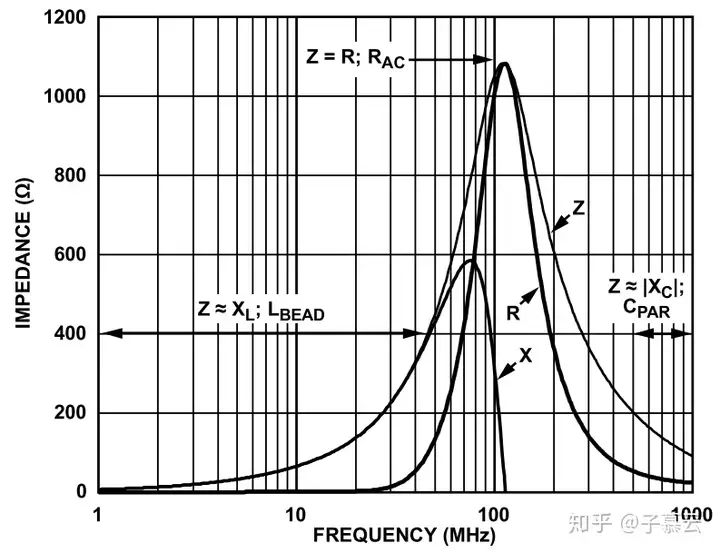 图7、磁珠的通用模型其中,Rdc可以直接查阅磁珠的规格书可获得;而Rac、L_bead及Cpar无法直接获取,但是可以根据规格书中的ZRX特性曲线计算所得,如图8示例。