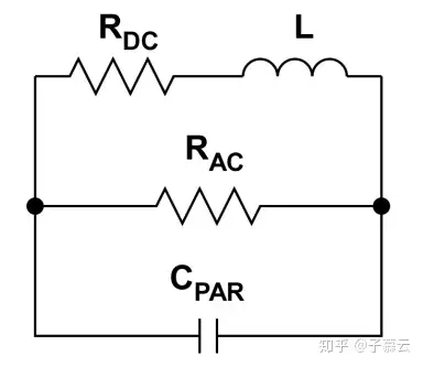 綜上所述,磁珠採用電感類似的繞線實現,因此磁珠首先是一個電感,繞線都是有直流阻抗的,所以磁珠的模型首先是(L+Rdc);接著,隨著頻率提高,磁珠的阻性開始突顯,經過某一個交越頻率之後,磁珠呈阻性Rac,所以在原先模型上並聯了Rac;頻率繼續提高,寄生電容屏蔽了磁珠,因此在L及Rac的基礎上再並聯了C。由此構建磁珠的等效模型,如圖4所示。