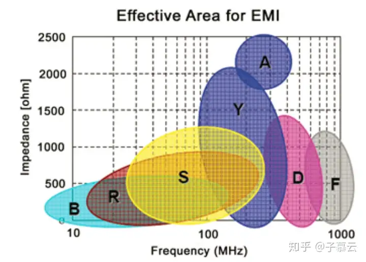 圖1、 磁珠的ZRX 特性曲線因此,在理論上(理想中)可以使得由磁珠和電容組合的低通濾波器在信號帶寬範圍內表現為感性,在信號帶寬之外特別是針對特定的頻率區間(噪音最嚴重的頻點)表現為阻性。所以,磁珠多用於EMI性能的改善之中,因為它對特定頻率區間的噪音抑制有特效。