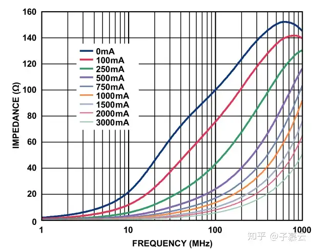 图11、磁珠的ZRX特性曲线随着DC电流的变化 (TDK MPZ1608S101A)磁珠规格书中的磁珠ZRX特性是磁珠的静态特性(DC Current=0mA时测得),图11表明磁珠的阻抗特性会随着流过的DC电流增加而降低。在使用磁珠时,特别是在电源场合应用磁珠时,需要考虑到磁珠的特性随着电流增加而发生变化的趋势。